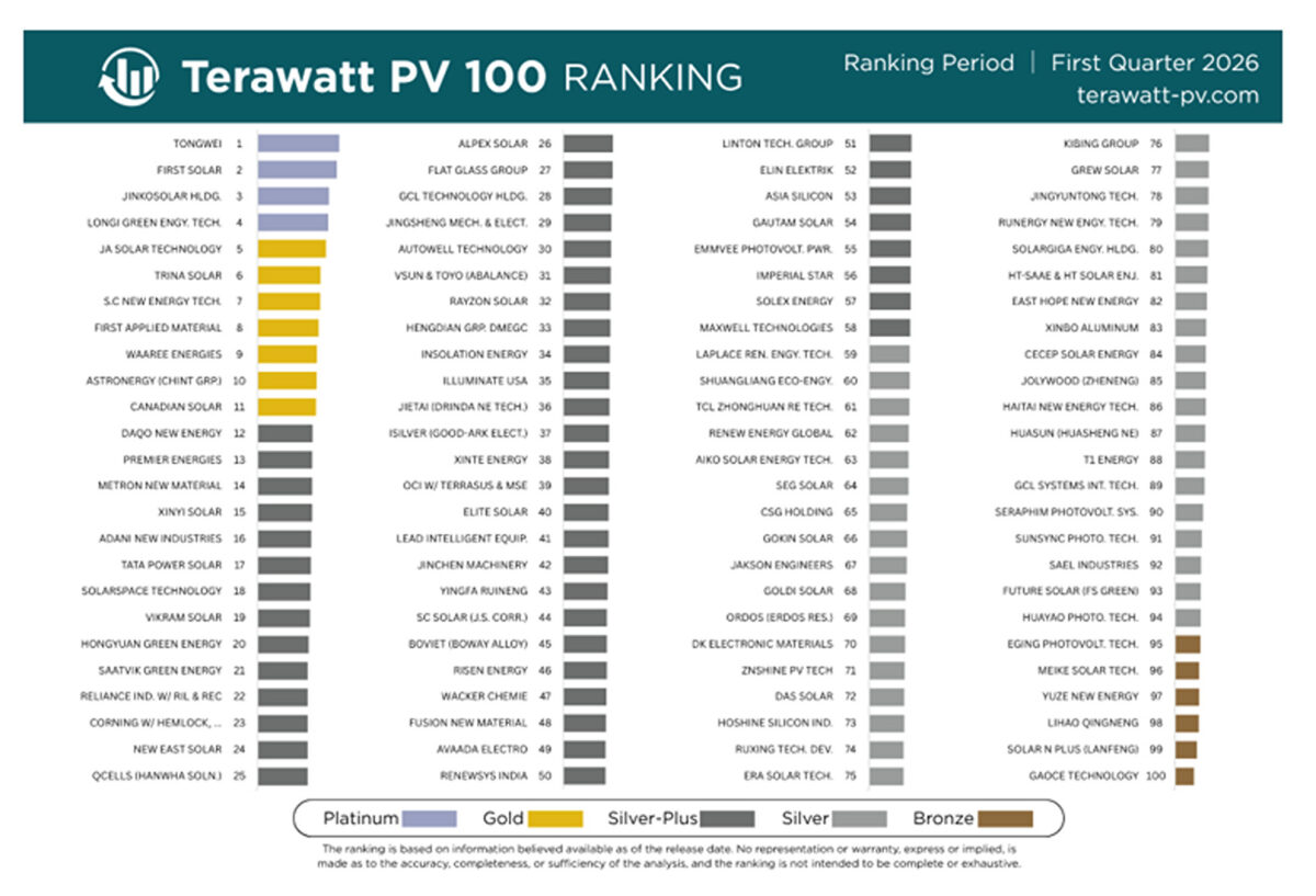Nova analiza “Terawatt PV 100” donosi pregled 100 najvažnijih tvrtki u sektoru, ali i pokazuje kako se stanje na tržištu brzo mijenja. Fokus analize više nije samo na proizvodnji, već i na financijskoj stabilnosti i transparentnosti poslovanja. Na samom vrhu ljestvice nalazi se kineski Tongwei, koji predvodi sektor zahvaljujući snažnoj proizvodnji silicija i solarnih ćelija. Odmah iza njega je američki First Solar, jedini ne-kineski proizvođač u samom vrhu, koji se ističe uravnoteženim poslovanjem i visokom razinom transparentnosti.